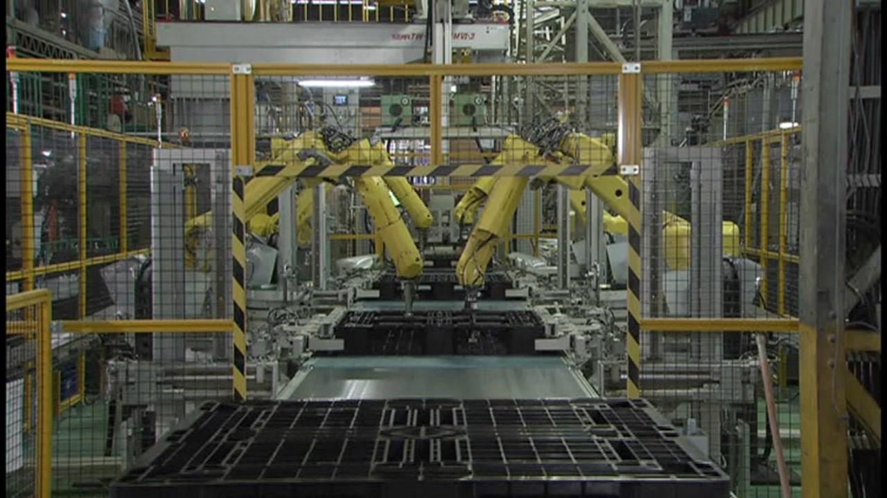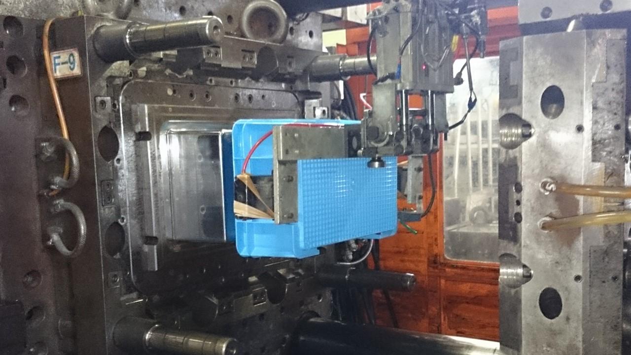 Once the material has cooled and set into shape, the metal mold automatically opens, and the product is lifted out by a robot and placed on a conveyor belt for finishing touches.