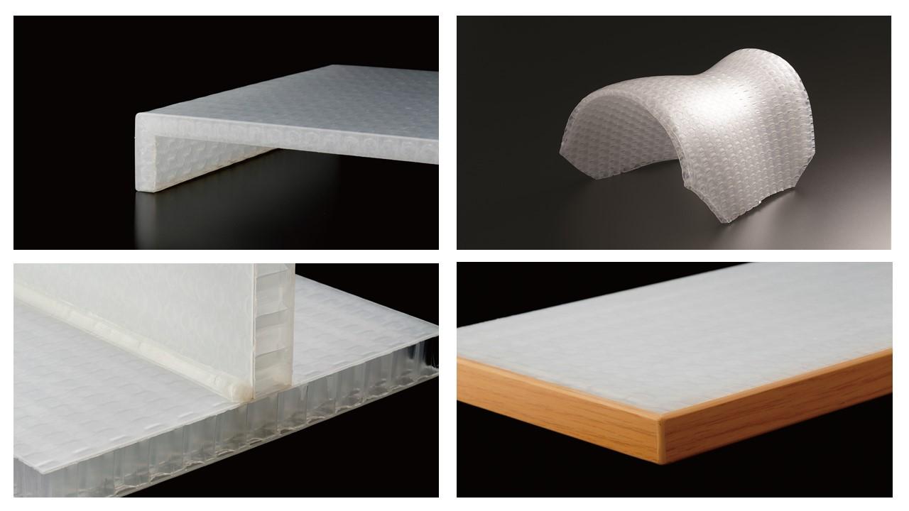本技術の特徴は‘高強度・超軽量素材’であるだけでなく、プラスチック(熱可塑性樹脂)の特性を活かしたフレキシブルな加工性にもあります。単なる板加工だけではなく、曲げ加工や3次元加工が可能であることから、用途の幅が格段に広がります。