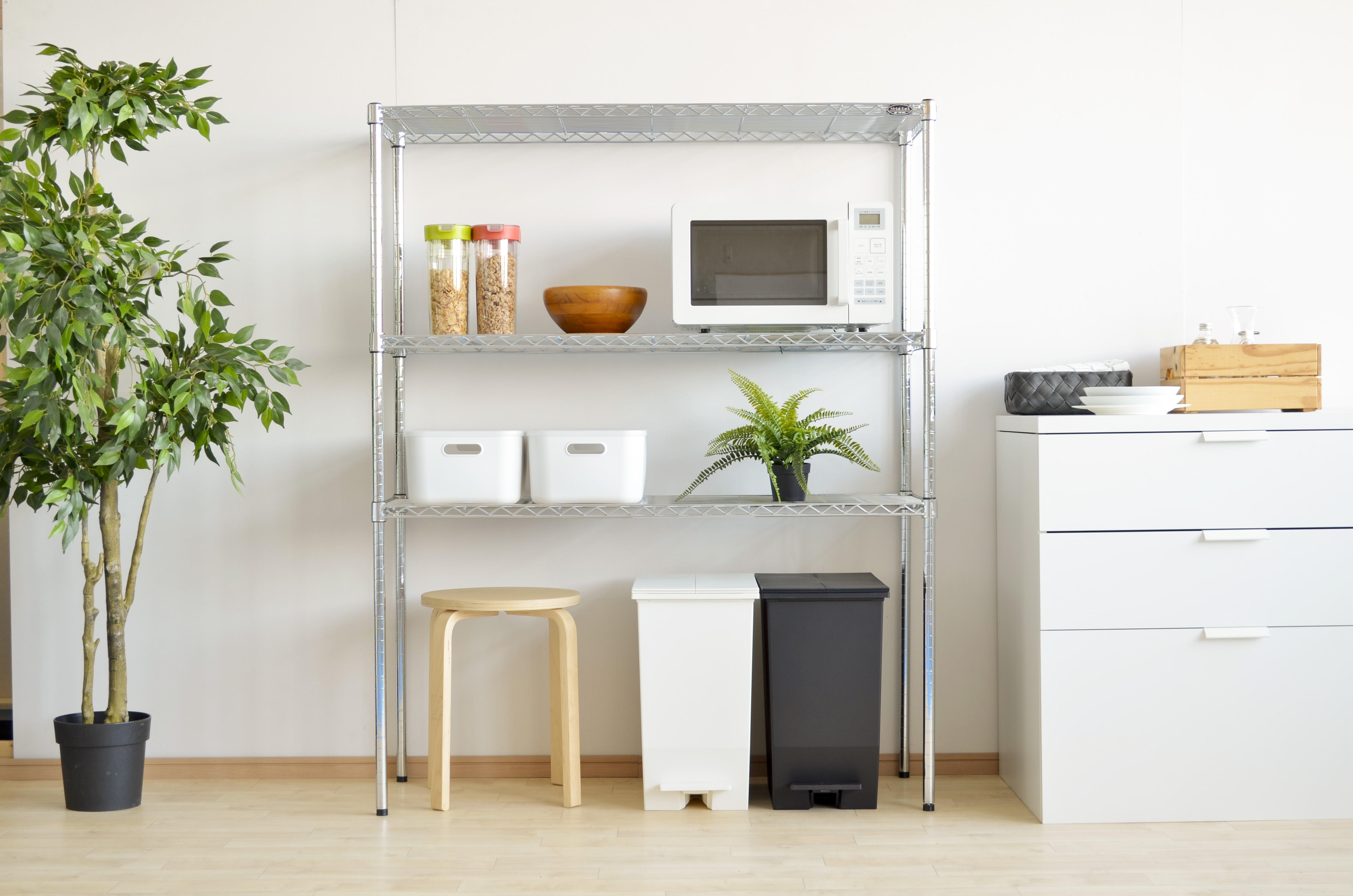 棚やカウンターの下など高さがない場所に置けて、そのままゴミが捨てられます。家具の下にぴったり収まるのでキッチン環境もすっきり整います。直線的なデザインはインテリアを選ばず、さりげなく空間になじみます。