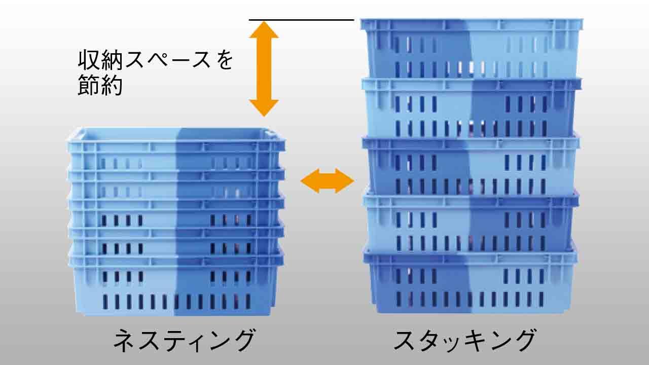 異色方向、異形状方向でスタッキングができ、180度回転することにより、ネスティングができるコンテナーです。
