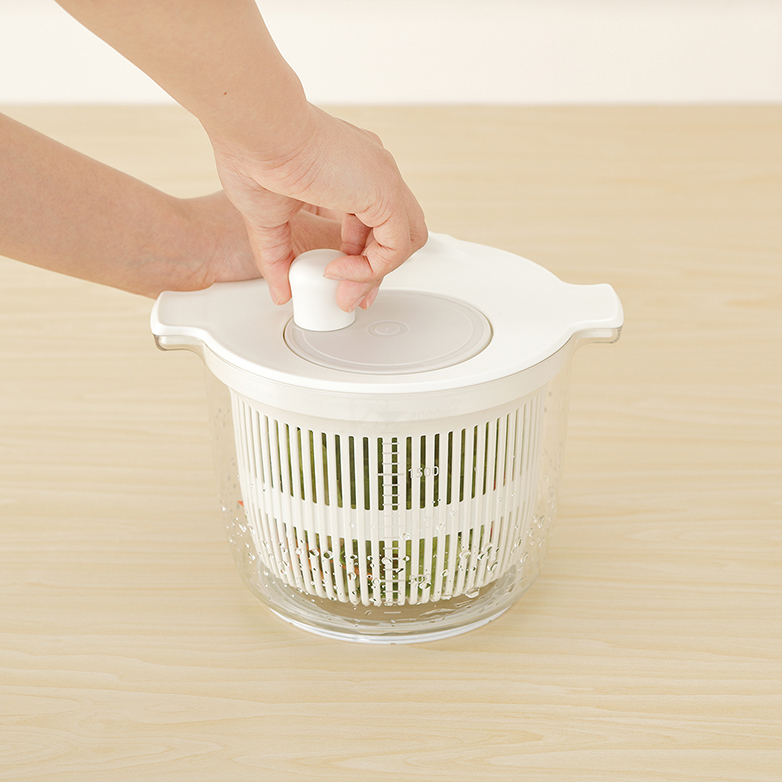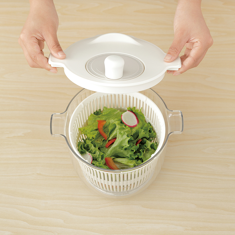 両手に収まるコンパクトサイズのサラダスピナー